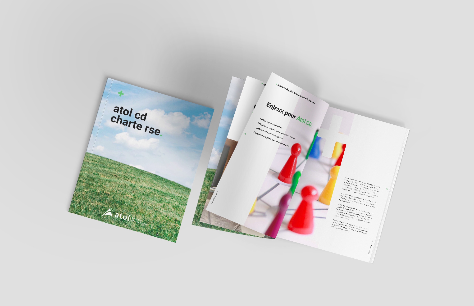 Mise en forme de la charte RSE d'Atol CD. Le maître mot était d'épurer au maximum la présentation, d'aérer le contenu afin de mettre en avant le message.
